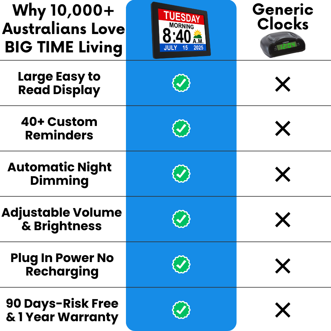 The Big Time Reminder Clock gives back peace of mind. No more losing track of the days or forgotten medications. With its bold display and supportive reminders, it promotes independence, helping users stay capable, confident and in control every single day.