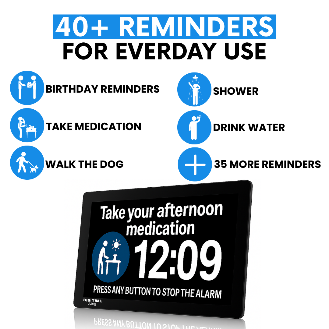 With 40+ built-in reminders for medication, birthdays, appointments, and daily routines, the Big Time Reminder Clock provides peace of mind while supporting independence keeping life simple, reliable, and stress free for users and their loved ones.
