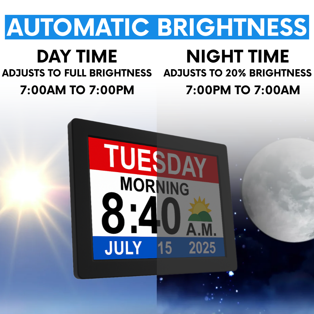 No need to fiddle with settings, the Big Time Reminder Clock adjusts itself. Bright enough to see clearly during the day, and dimmed at night so it won’t disturb your sleep. It works automatically, giving you comfort and convenience around the clock, without extra effort.